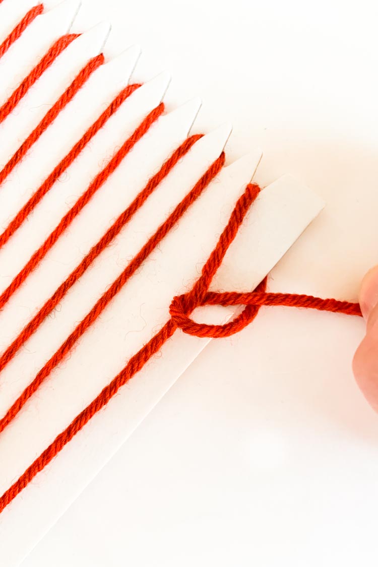 Begin in een van de hoeken van je kartonnen weefraam. Wikkel je draad om de hoek en leg er een knoopje in. Zorg ervoor dat je een eindje over laat van ongeveer 10 cm. Zodra je klaar bent met weven kun je die draad gebruiken om de eindjes weg te werken.