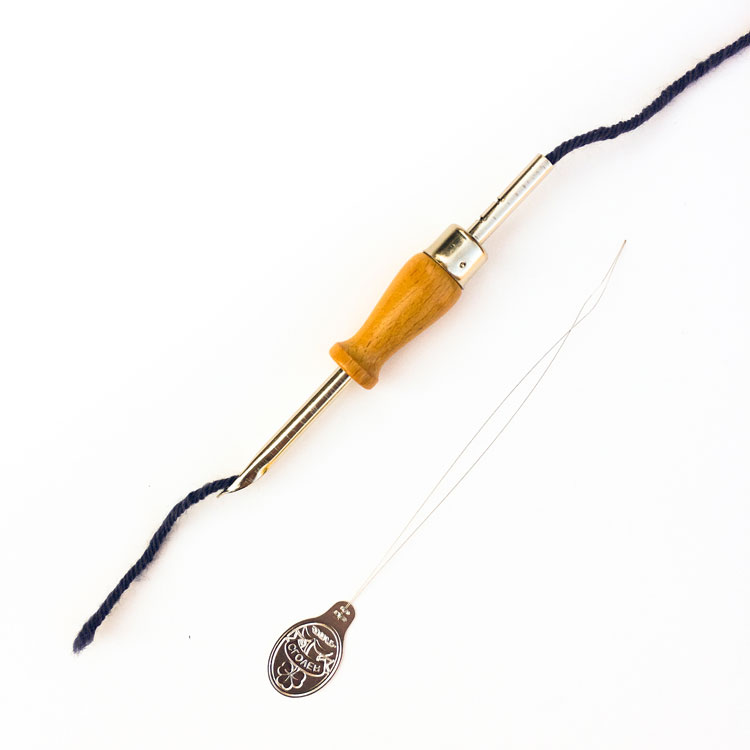 To get your wool into your punch needle you will need a threading tool. For the adjustable punch needle you can use two options 1) a metallic wire threader or 2) a long needle of at least 15 cm. Without these tools you will strugle to poke your yarn through the needle.