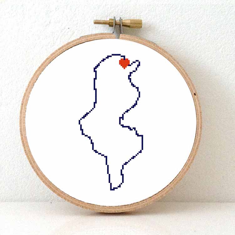 Tunesië kaart kruissteek patroon. Dit moderne kruissteek patroon toont de kaart van Tunesië, met een hart voor de hoofdstad Tunis. Combineer met andere kaarten uit onze Stitch a Map collectie. Laat de wereld zien waar je allemaal geweest bent! Creëer een origineel cadeau voor een vriend die emigreert of een internationale bruiloft.