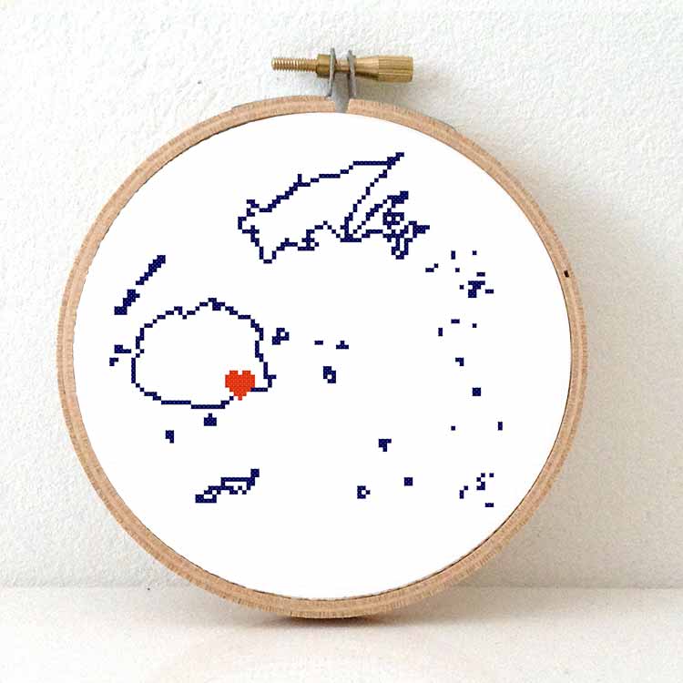 Fiji kaart kruissteek patroon. Dit moderne kruissteek patroon toont de kaart van Fiji, met een hart voor de hoofdstad Suva. Combineer met andere kaarten uit onze Stitch a Map collectie. Laat de wereld zien waar je allemaal geweest bent! Creëer een origineel cadeau voor een vriend die emigreert of een internationale bruiloft.