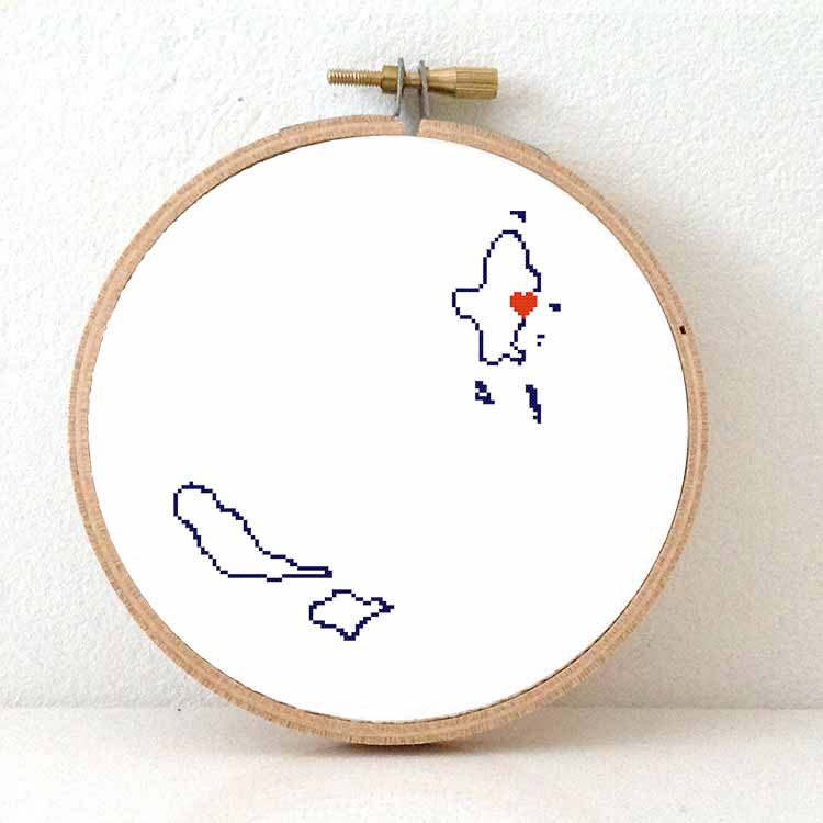 Wallis en Futuna kaart kruissteek patroon. Dit moderne kruissteek patroon toont de kaart van Wallis en Futuna, met een hart voor de hoofdstad: Mata-Utu, ook gespeld als Mata Utu of Matâ’utu. Combineer met andere kaarten uit onze Stitch a Map collectie. Laat de wereld zien waar je allemaal geweest bent! Creëer een origineel cadeau voor een vriend die emigreert of een internationale bruiloft.