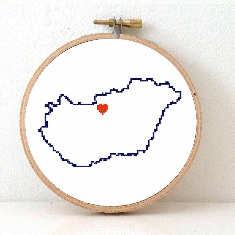Hongarije kaart kruissteek patroon. Dit moderne kruissteek patroon toont de kaart van Hongarije, met een hart voor de hoofstad Boedapest. Combineer met andere kaarten uit onze Stitch a Map collectie. Laat de wereld zien waar je allemaal geweest bent! Creëer een origineel cadeau voor een vriend die emigreert of een internationale bruiloft.