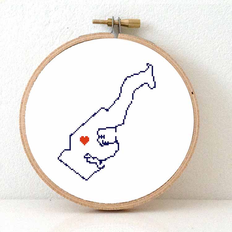 Monaco kaart kruissteek patroon. Dit moderne kruissteek patroon toont de kaart van Monaco, met een hart voor het centrum. Combineer met andere kaarten uit onze Stitch a Map collectie. Laat de wereld zien waar je allemaal geweest bent! Creëer een origineel cadeau voor een vriend die emigreert of een internationale bruiloft.
