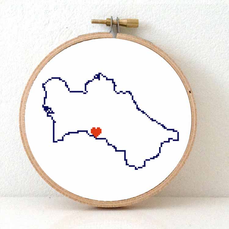 Turkmenistan kaart kruissteek patroon. Dit moderne kruissteek patroon toont een kaart van Turkmenistan, met een hard voor de hoofdstad Asjchabad. Combineer met andere kaarten uit onze Stitch a Map collectie. Laat de wereld zien waar je allemaal geweest bent! Creëer een origineel cadeau voor een vriend die emigreert of een internationale bruiloft.