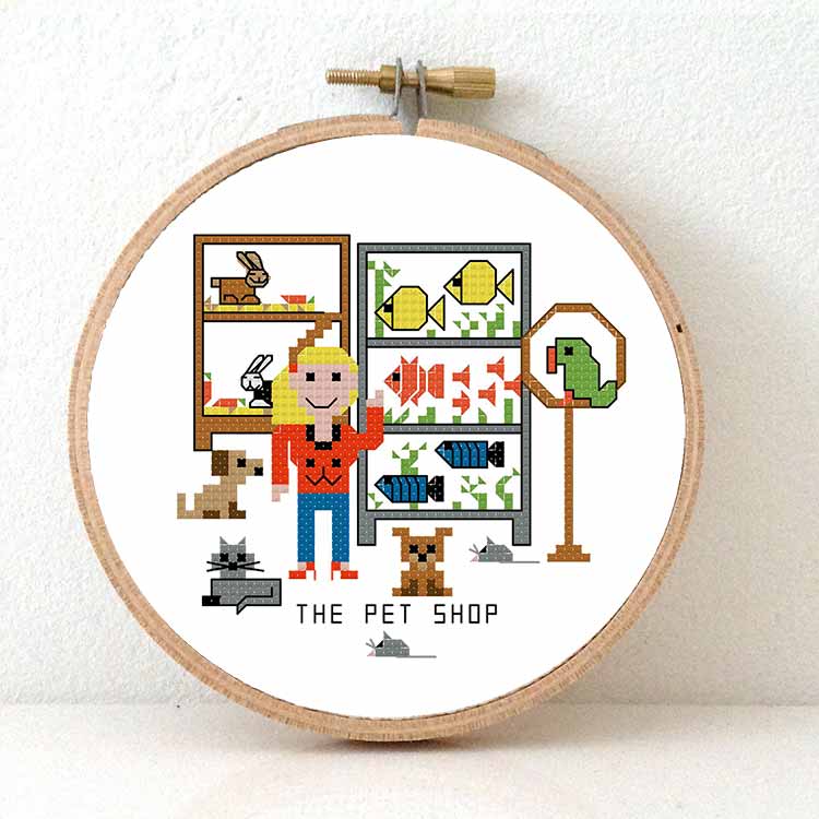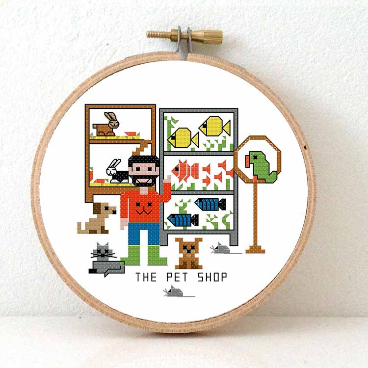 Dit zijn 2 kruissteek patronen uit onze moderne beroepen collectie. Het patroon toont de dierenwinkel. Allebei de verkopers zijn gek op dieren en kunnen zich geen beter leven voorstellen dan een leven waarin ze door dieren omringd worden. Op het patroon zie je een paar konijnen, een papegaai, een aantal vissen, een puppy en een kat. Oeps! – er schieten her en der ook wat muizen weg. Je ontvangt het patroon voor zowel de mannelijke als de vrouwelijke medewerker. Dit is een leuk cadeautje voor elke dierenliefhebber, eigenaar van een dierenwinkel of medewerker van een dierenzaak.