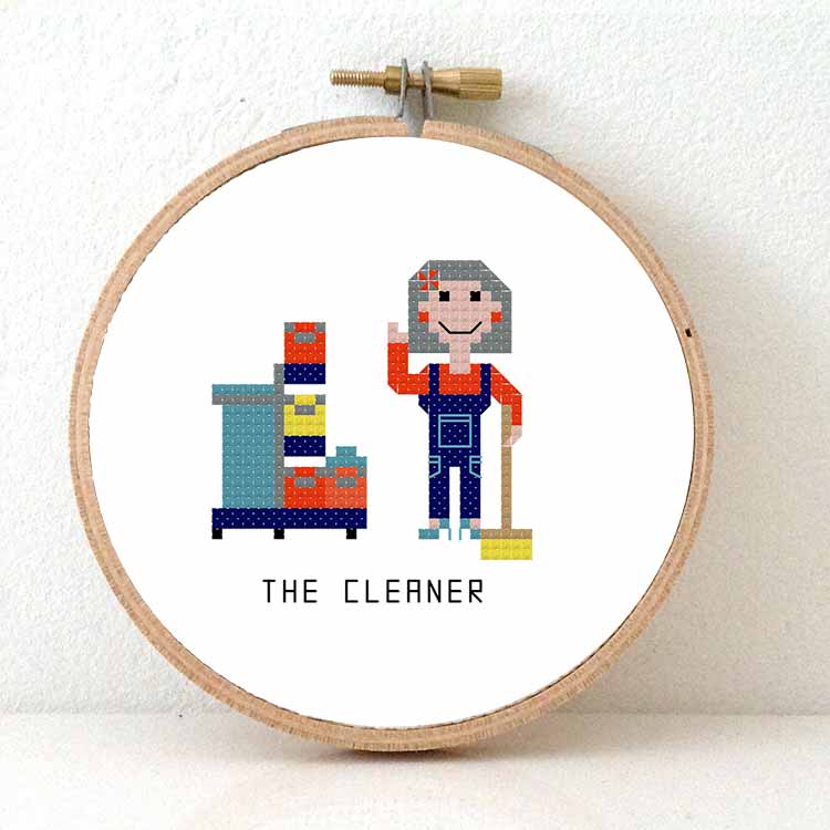 2 x Schoonmaker kruissteek patroon. Dit kruissteek patroon uit onze moderne beroepen collectie toont “de schoonmaker”: de mannelijke versie is geïnspireerd op mijn oom die als schoonmaker werkte in een van de voetbalstadions van Nederland. Je ontvangt ook een vrouwelijke versie van het patroon. Creëer een origineel cadeautje voor je eigen favoriete schoonmaker of schoonmaakbedrijf.