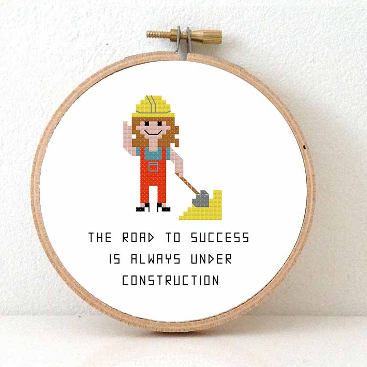 DIY cadeau voor een bouwvakker. Met dit artikel ontvang je 2 kruissteek patronen om zowel de mannelijke als de vrouwelijke bouwvakker te kunnen maken. Dit kruissteek patroon uit onze moderne beroepen collectie toont “de bouwvakker”: een jonge bouwvakker in een oranje overall, klaar om de handen uit de mouwen te steken. Het patroon bevat ook het citaat “the road to success is always under construction”.