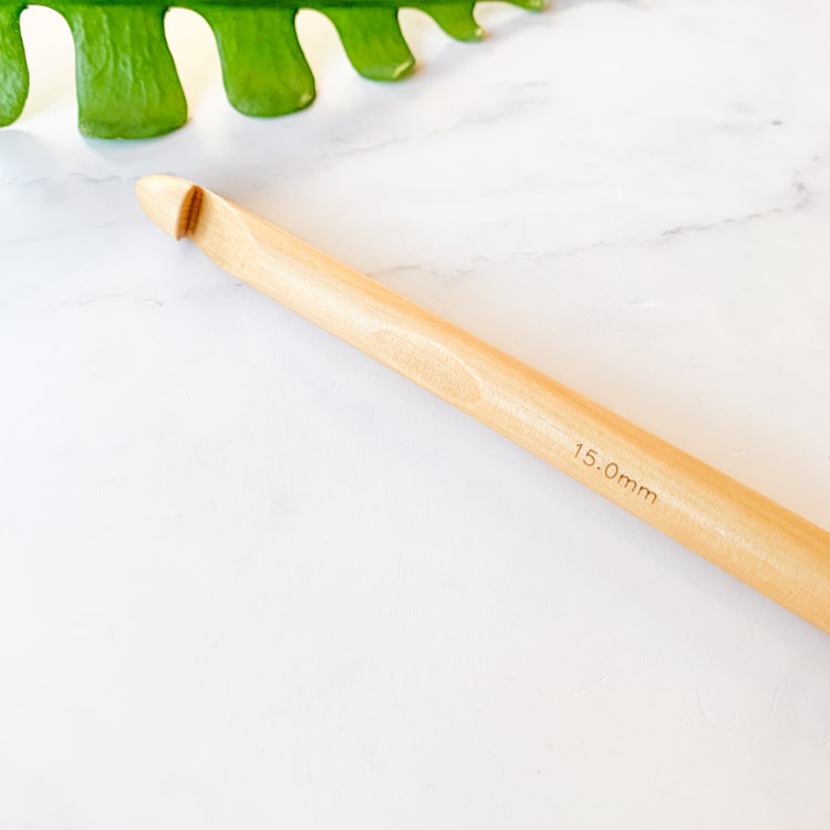 Een mooie natuurlijk houten bamboe haaknaald van 15mm dikte.