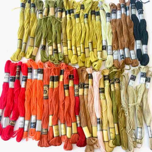 - De kleur zit dicht bij DMC kleur 3078. Met een DMC kleurenkaart met echt garen kun je de kleur vergelijken en bijpassende kleuren borduurgaren vinden.