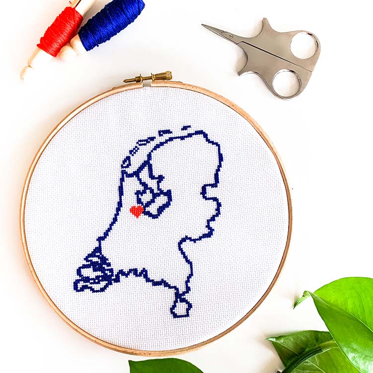 Nederland kaart kruissteek borduurpakket. Dit moderne kruissteek borduurpakket toont de kaart van Nederland, met een hart voor de hoofdstad Amsterdam. Het bevat alle materialen die je nodig hebt om dit patroon te maken. Het pakket kan iets afwijken van het plaatje, afhankelijk van de beschikbaarheid. Maar de inhoud is hetzelfde!