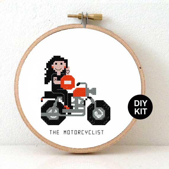 Dit is een modern borduurpakket uit onze Stitch a Sport collectie. Het toont “de motorrijder”. Dit is de versie met een vrouw. Je kan de versie met een man hier in onze webshop vinden. Ze rijden lekker rond op hun indrukwekkende motoren en laten je graag hun tattoos zien.