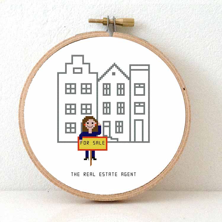 Cadeautje voor je makelaar. Moderne borduurpatroon uit onze moderne beroepen collectie. Het toont de vrouwelijke “makelaar”. Ze is hard aan het werk om huizen in Amsterdam te verkopen. Je vindt de mannelijke versie hier in onze webshop.