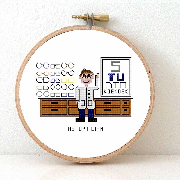 Dit is het mannelijke opticien kruissteek borduurpakket uit onze Stitch a Job collectie. Dit is voor de mannelijke versie. Je kan de vrouwelijke versie hier in onze webshop vinden. Hun winkel heeft een ruim assortiment hippe brillen waar je uit kan kiezen. Aangezien ze van kruissteek borduren houden, zit er ook wat sluikreclame in het decor ;-). Als bonus ontvang je een patroon met het citaat “sometimes all you need is a new perspective”, en een patroon met alleen de naam van het beroep.