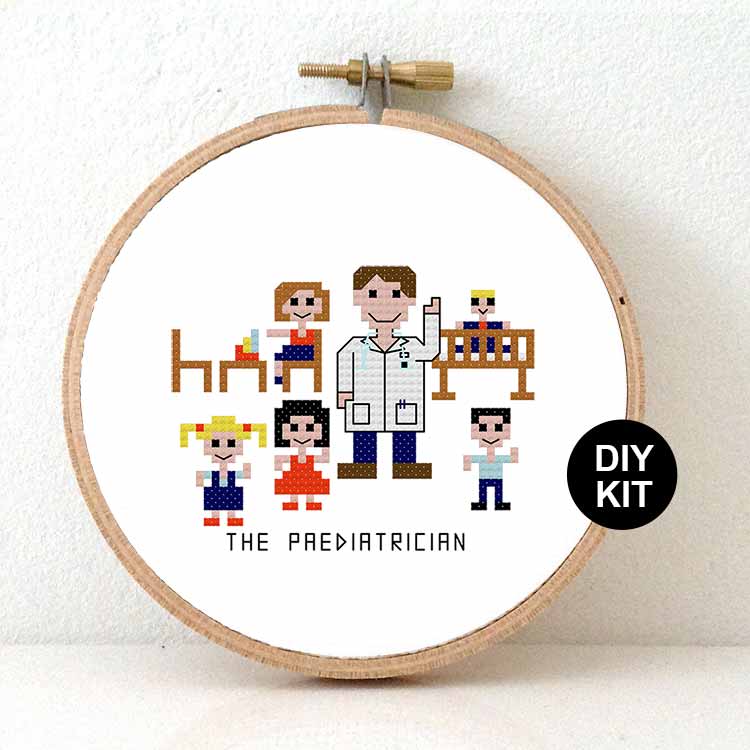 Gemakkelijk kruissteek borduurpakket uit onze moderne beroepen collectie. Het toont de “kinderarts”. De dokter wordt omringd door kinderen en er is zelfs een baby te zien op het ontwerp. Ze hebben allemaal een grote lach op hun gezicht omdat ze het zo fijn vinden om geholpen te worden door deze aardige dokter. Dit is de mannelijke variant. Je kan het patroon voor de kinderarts (vrouw) ook in onze webshop vinden. Maak het als een verjaardagscadeautje voor een dokter, of als een bedankje voor de arts van je kind.