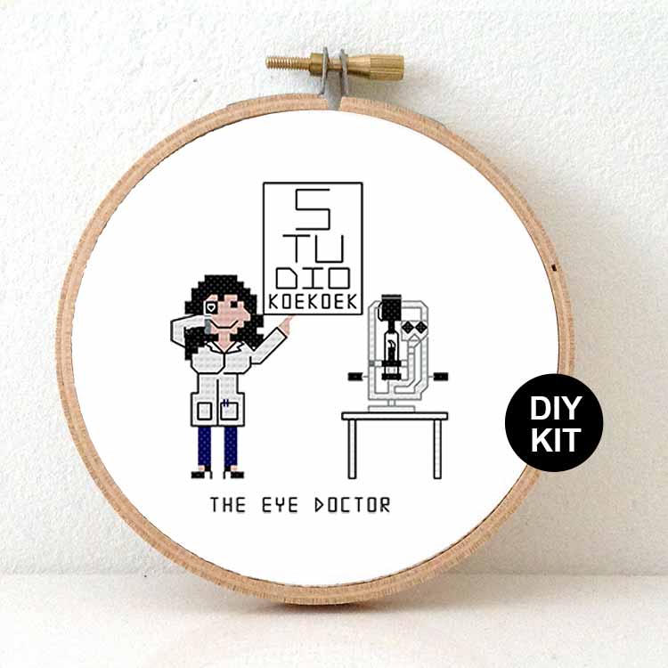 Dit moderne kruissteek borduurpakket toont het patroon “de oogarts”, een gemakkelijk patroon uit onze Stitch a Job collectie. Ze beschikt over alle instrumenten om je ogen te controleren en geeft je alle medische hulp die je nodig hebt om je zicht te verbeteren. Je kan de mannelijke variant hier in onze webshop vinden. Mix en match met andere pakketten uit onze Stitch a Job collectie om je hele familie na te borduren.
