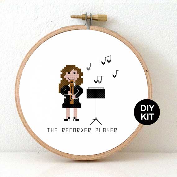 Blokfluitiste. Dit is een modern kruissteek borduurpakket. Het toont de “blokfluitiste”: een getalenteerd musicus die graag je favoriete muziek ten gehore brengt! Dit item is voor de variant met een vrouw erop. Je vindt in onze webshop ook de mannelijke versie.