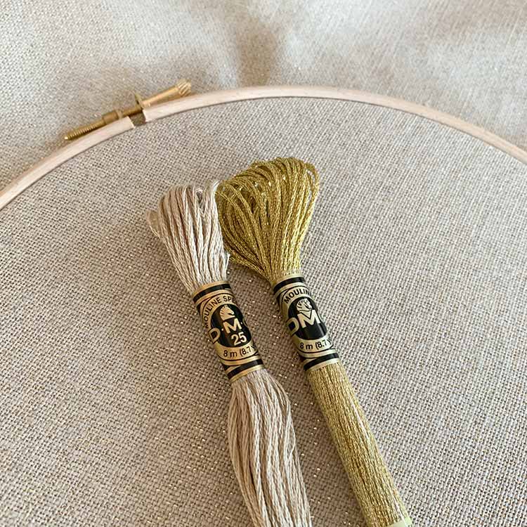 - De linnen stof lijkt op DMC borduurgaren kleur 3782. De glinstering heeft een gouden tint zoals E3821
