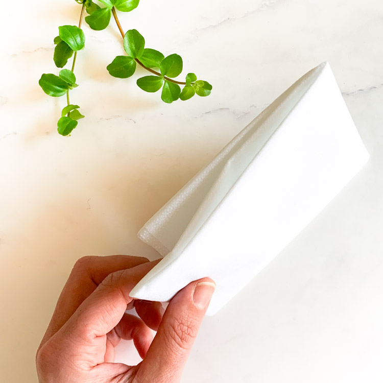 - Strijk gedurende 6 seconden rechtstreeks op de vlieseline. Zorg ervoor dat je de hele vlieseline strijkt, dus ook alle hoeken, en houd het strijkijzer in beweging.