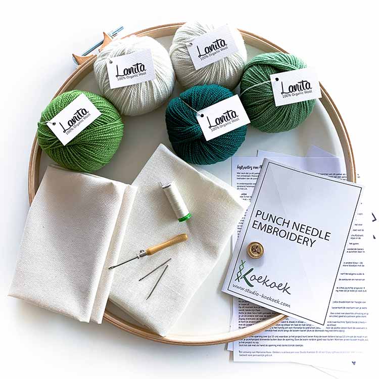 Met dit ecologische punchpakket kun je een botanisch kussen punchen. Gebruik het als een hoes voor op een stoelzitting of voeg vulling toe om een trendy kussen met bladeren te maken. Het bevat premium ecologische punchmaterialen. Zorgvuldig samengesteld voor de perfecte match tussen naald, stof en garen. Het pakket bevat een naald en materialen voor de voor- en achterkant. Het is een ontwerp van de Nederlandse textielartiest Marianne Dekkers – Roos.